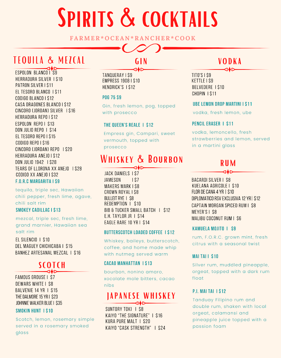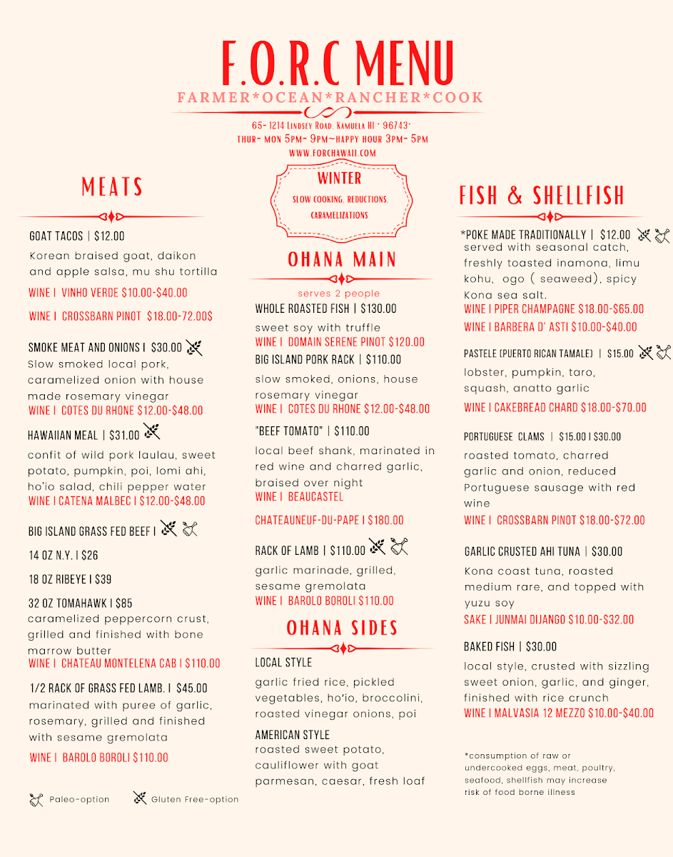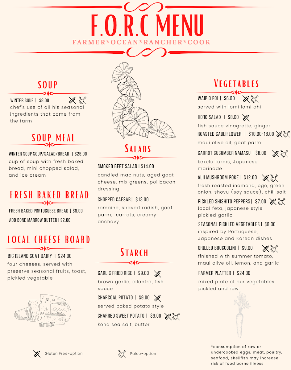 Welcome to FORC Restaurant, a charming dining destination in Waimea, HI, where tradition meets innovation in every dish. Located at 65-1214 Lindsey Rd, this eatery prides itself on its farm-to-table philosophy, utilizing fresh, local ingredients to craft an exquisite menu.